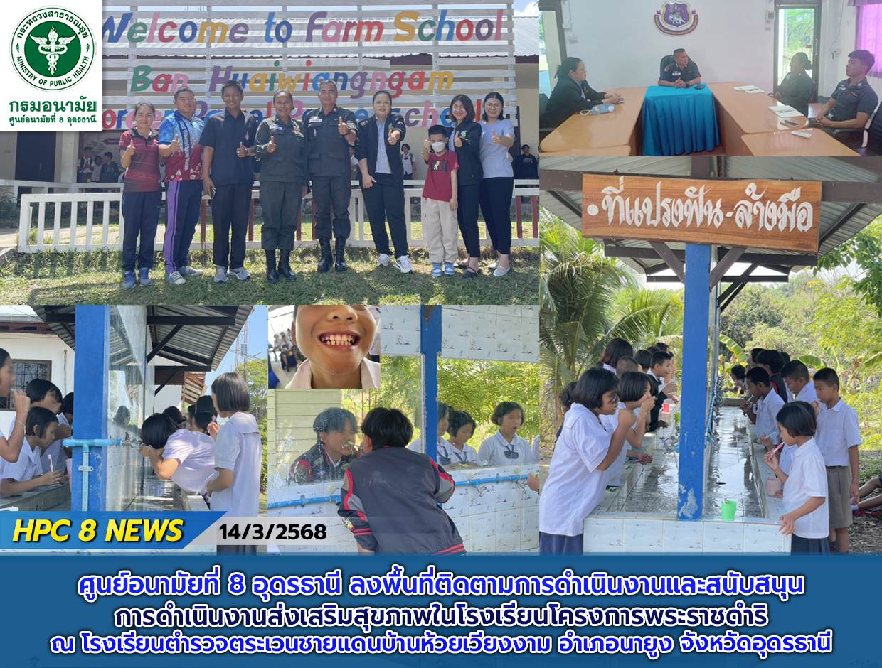 วันที่ 14 มีนาคม 2568 ศูนย์อนามัยที่ 8 อุดรธานี นำโดย นางสาวสุกัญญา คณะวาปี ผู้ช่วยผู้อำนวยการศูนย์อนามัยที่ 8 อุดรธานี และกลุ่มพัฒนาการส่งเสริมสุขภาพวัยเรียนวัยรุ่น พร้อมด้วย พ.ต.ท สุชาติ บุญหาญ นายตำรวจนิเทศงานโครงการตามพระราชดำริ กองกำกับตำรวจตระเวนชายแดนที่ 24 ได้ลงพื้นที่ติดตามการดำเนินงานและสนับสนุนการดำเนินงานส่งเสริมสุขภาพในโรงเรียนโครงการพระราชดำริ เพื่อติดตามการดำเนินงานส่งเสริมสุขภาพในโรงเรียน ประเด็นภาวะโภชนาการ สุขภาพช่องปาก การตรวจสุขภาพนักเรียน ให้คำแนะนำในการดำเนินงานโรงเรียนส่งเสริมสุขภาพระดับมาตรฐานสากล และให้คำแนะนำในการลงข้อมูลในโปรแกรม RPHIC พร้อมทั้งได้ทำกิจกรรมส่งเสริมสุขภาพช่องปากกับนักเรียนแกนนำ ประกอบไปด้วย กิจกรรมให้ทันตสุขศึกษากิจกรรมแปรงฟันหลังอาหารกลางวันและกิจกรรมตรวจประสิทธิภาพการแปรงฟัน (ย้อมสีฟัน) ผู้เข้าร่วมกิจกรรมในครั้งนี้ ประกอบด้วย ครูใหญ่ ครูอนามัยโรงเรียนคณะครูและนักเรียนชั้นแกนนำชั้น ป. 4 - ป. 6 จำนวน 45 คน ณ โรงเรียนตำรวจตระเวนชายแดนบ้านห้วยเวียงงาม อำเภอนายูง จังหวัดอุดรธานี