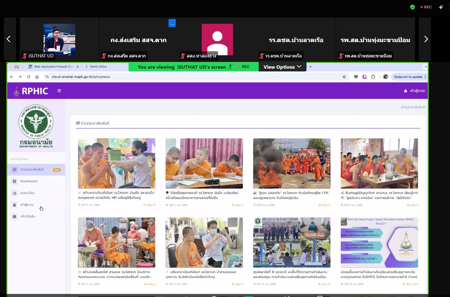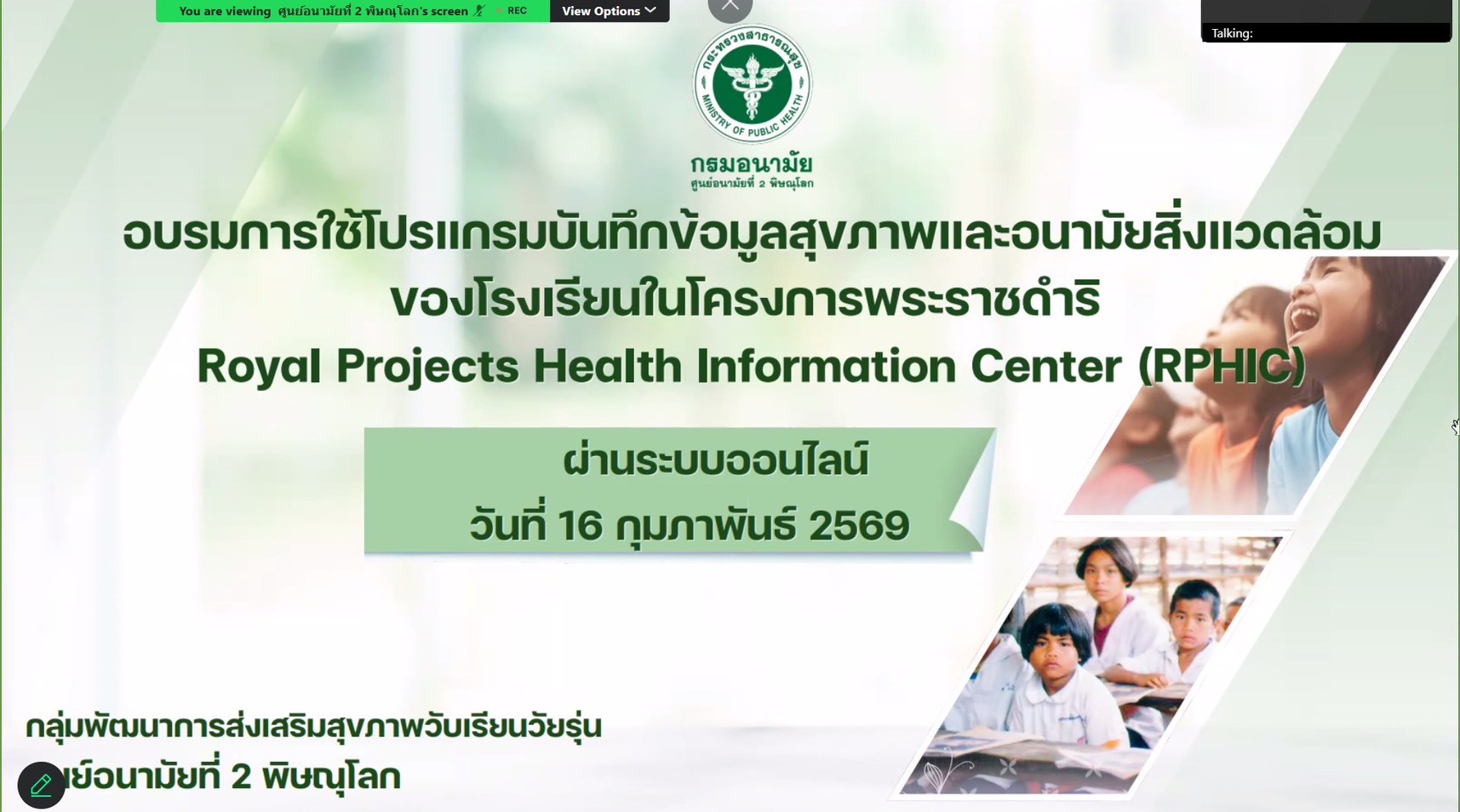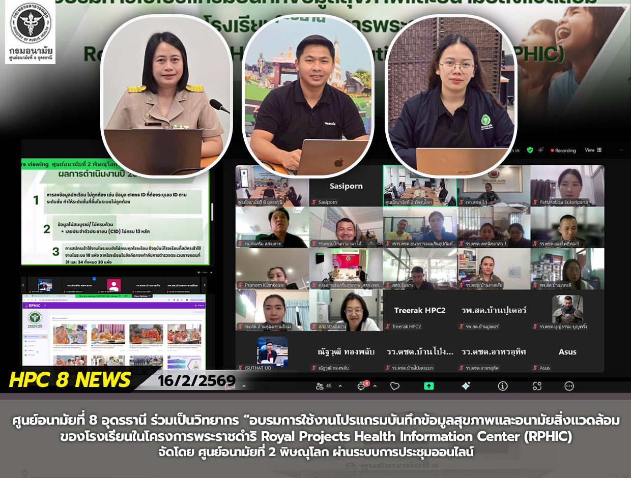 วันที่ 16 กุมภาพันธ์ 2569 นายแพทย์กฤษฎา ศิริชัยสิทธิ์ ผู้อำนวยการศูนย์อนามัยที่ 8 อุดรธานี มอบหมายให้ นายสุทัศน์ บุราณ, นางสาวพรพิมล บุตะลา และนางสาวศศิพร ตั้งมั่นดี ร่วมเป็นวิทยากร อบรมการใช้งานโปรแกรมบันทึกข้อมูลสุขภาพและอนามัยสิ่งแวดล้อมของโรงเรียนในโครงการพระราชดำริ Royal Projects Health Information Center (RPHIC) จัดโดย ศูนย์อนามัยที่ 2 พิษณุโลก ผ่านระบบออนไลน์ มีวัตถุประสงค์เพื่อสร้างความเข้าใจผู้ปฏิบัติงาน ครูอนามัย และเจ้าหน้าที่สาธารณสุข ในการนำเข้าข้อมูลและการใช้งานระบบฐานข้อมูลสุขภาพและสิ่งแวดล้อมตามแนวพระราชดำริ Royal Project Health Information Center (RPHIC) ให้มีข้อมูลด้านสุขภาพและอนามัยสิ่งแวดล้อมที่เป็นปัจจุบัน สามารถนำไปใช้ประโยชน์จากฐานข้อมูลร่วมกันกับหน่วยงานที่เกี่ยวข้องในการเฝ้าระวังปัญหาสุขภาพของนักเรียนในถิ่นทุรกันดาร (กพด.) ได้อย่างถูกต้องและครอบคลุมทุกแห่ง ในเขตสุขภาพที่ 2 ผู้เข้าร่วมประชุม ได้แก่ ผู้อำนวยการโรงเรียน ครูใหญ่ ครูอนามัยโรงเรียน ครูด้านอนามัยสิ่งแวดล้อม เจ้าหน้าที่จากสำนักงานสาธารณสุขจังหวัด สำนักงานสาธารณสุขอำเภอ รพ.สต. ของโรงเรียนในโครงการพระราชดำริ จำนวนทั้งสิ้น 50 User